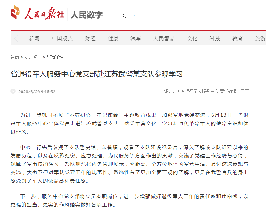 【人民日报客户端】省退役军人服务中心党支部赴江苏武警某支队参观学习