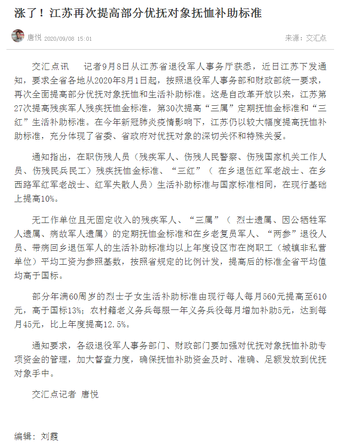 【交汇点】涨了!江苏再次提高部分优抚对象抚恤补助标准